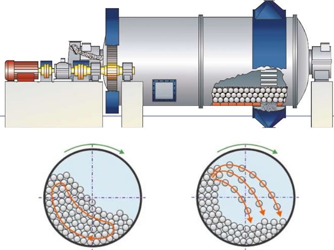 球磨機工作時,物料由進料端空心軸裝入筒體內(nèi),當(dāng)球磨機筒體轉(zhuǎn)動時候,研磨體由于慣性、離心力和摩擦力作用,使它附在筒體襯板上被筒體帶走,當(dāng)被帶到一定的高度時候,由于其本身的重力作用而被拋落,下落的研磨體像拋射體一樣將筒體內(nèi)的物料給擊碎。物料由進料裝置經(jīng)入料中空軸螺旋均勻地進入球磨機第一倉,該倉內(nèi)有階梯襯板或波紋襯板,內(nèi)裝不同規(guī)格鋼球,筒體轉(zhuǎn)動產(chǎn)生離心力將鋼球帶到一定高度后落下,對物料產(chǎn)生重擊和研磨作用。物料在第一倉達到粗磨后,經(jīng)單層隔倉板進入第二倉,該倉內(nèi)鑲有平襯板,內(nèi)有鋼球,將物料進一步研磨。粉狀物通過卸料箅板排出,完成粉磨作業(yè)。